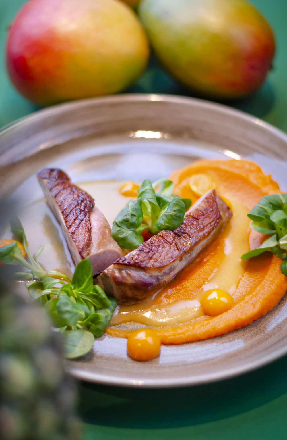 54,- Poddymiona pierś z kaczki, sos anansowy na demiglace, purée z batata z kokosem, miechunka peruwiańska