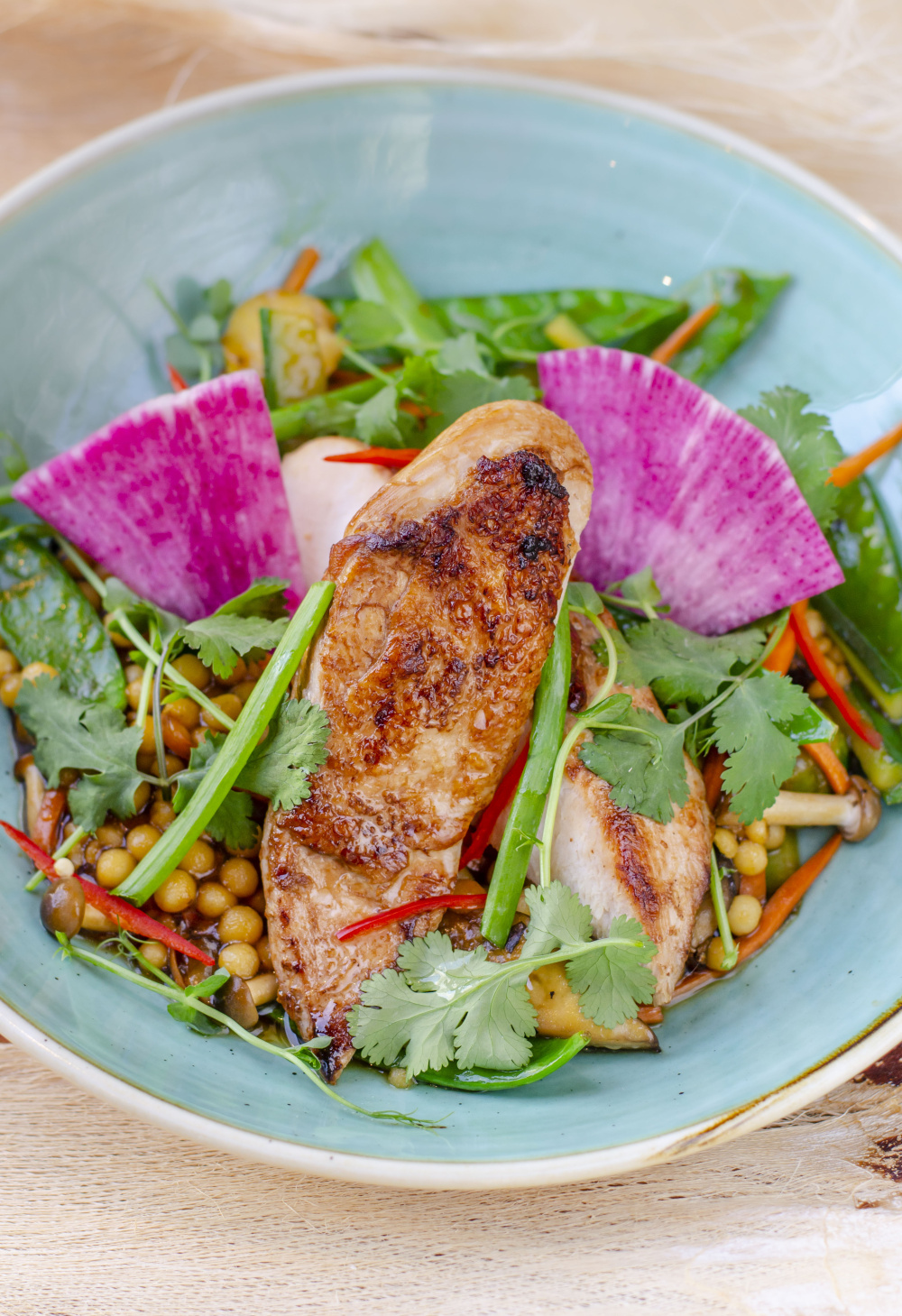 47,- Pierś z kurczaka zagrodowego w orientalnym sosie, warzywa stir-fry, groszek cukrowy, portobello, shimei, kuskus mograbieh