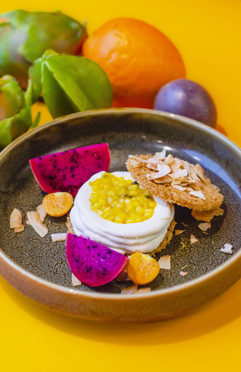 32,- Markiza z ciastka kadaif z kremem kokosowym, świeże mango i marakują