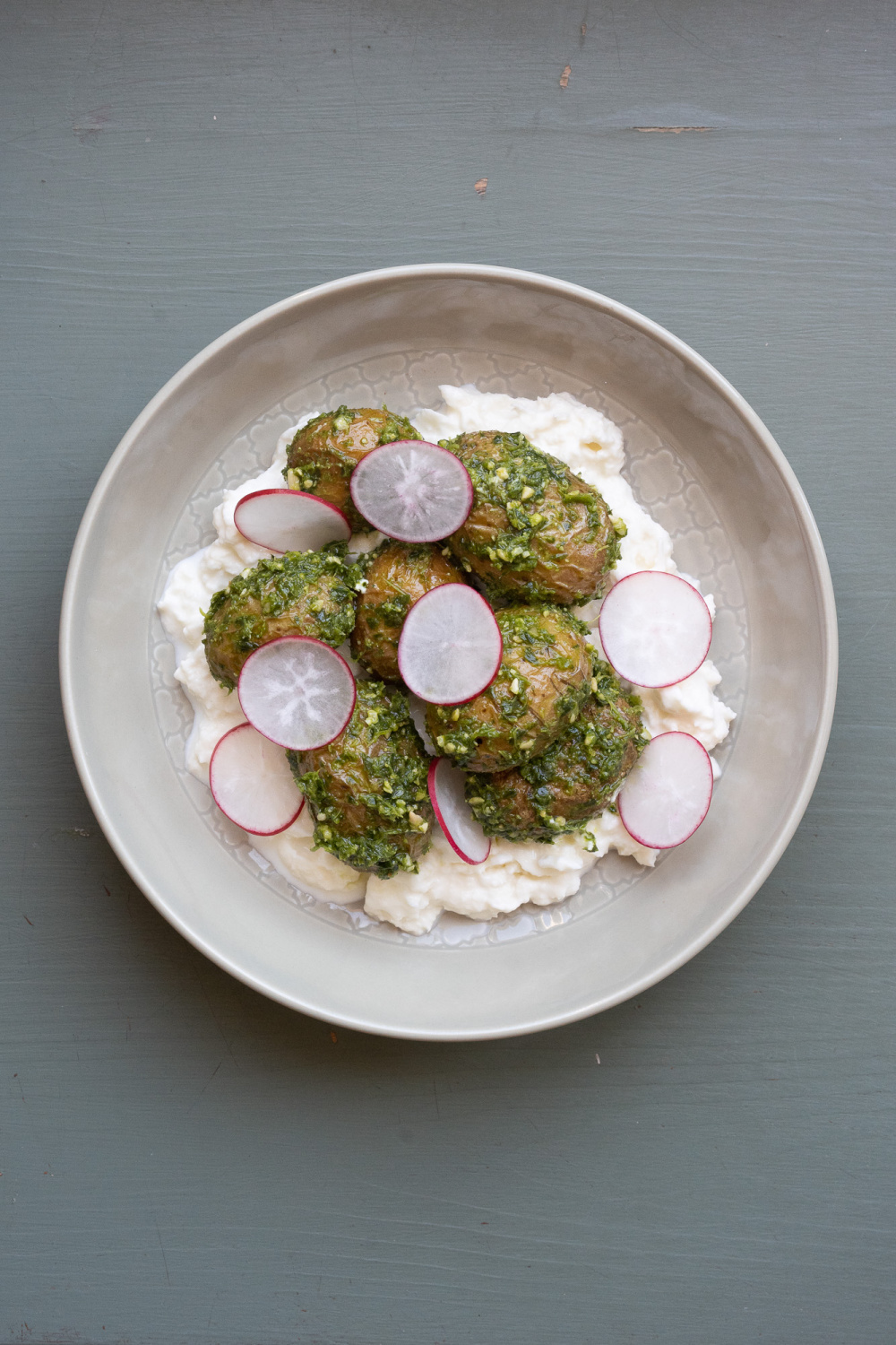 Na śmietankowej stracciatelli / pesto pietruszkowe / rzodkiewka