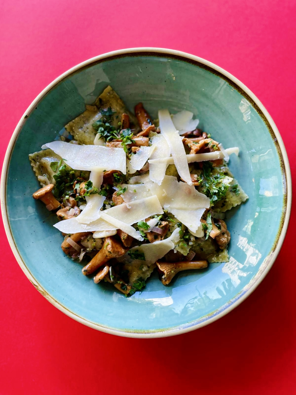 54,- Ravioli z kurkami na maśle z czosnkiem, pietruszką i płatkami parmezanu